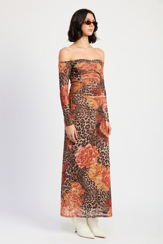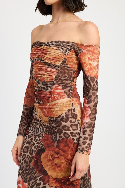 Make a statement with this eye-catching off-shoulder crop top that combines trendy animal print with warm orange and red floral tones.