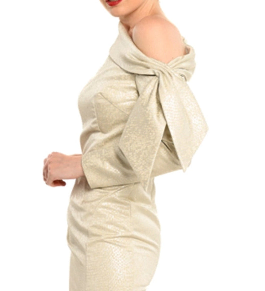 The champagne sheath silhouette showcases an architectural fold-over asymmetrical shoulder paired with an intricate pleated crossover bow—details that command attention without sacrificing elegance.