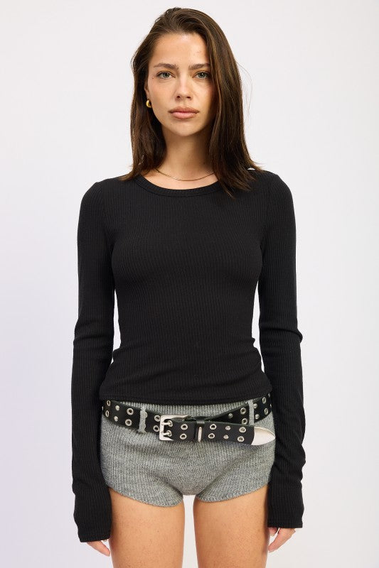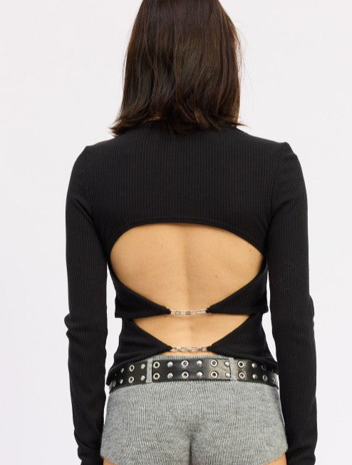 Step into the season with Emory Park's Black Ribbed Top, designed to turn heads. This long-sleeve, round-neck style features a chic open-back with a double-row chain detail that adds just the right amount of edge. Perfect for fall and winter, its ribbed fabric keeps you cozy while staying effortlessly trendy and stylish. Pair it with your favorite jeans or skirt for a look that’s playfully sophisticated.
