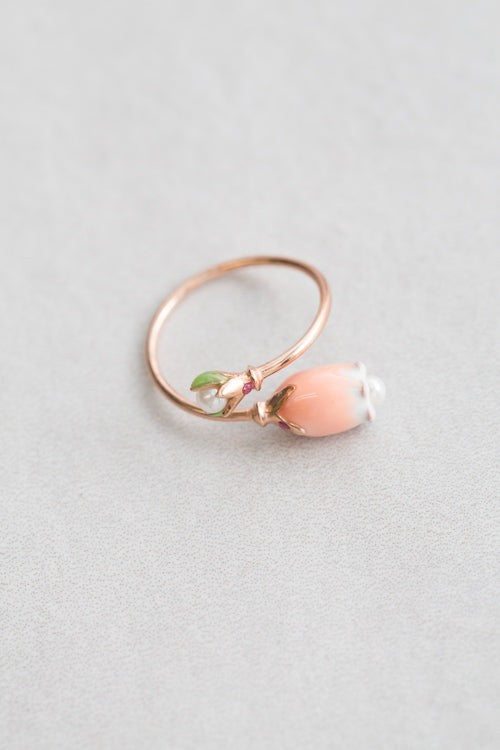 This isn't your average ring—it's a bold declaration of style. Lovoda's coral blossom design features a hand-crafted porcelain flower adorned with pearl accents, all anchored by a sterling silver band with 14K rose gold plating.