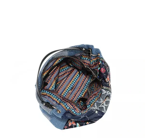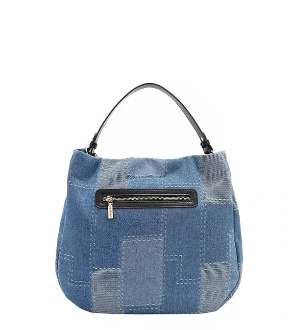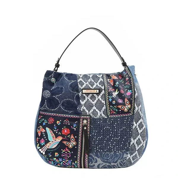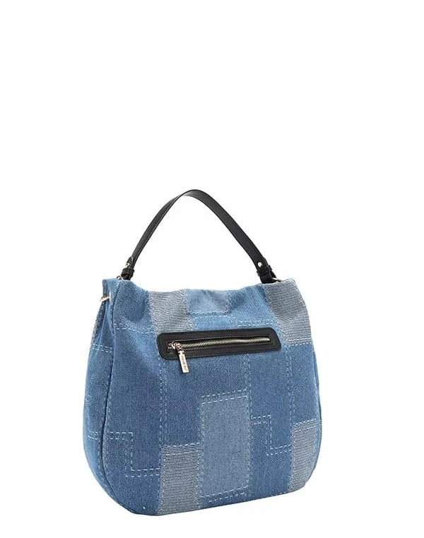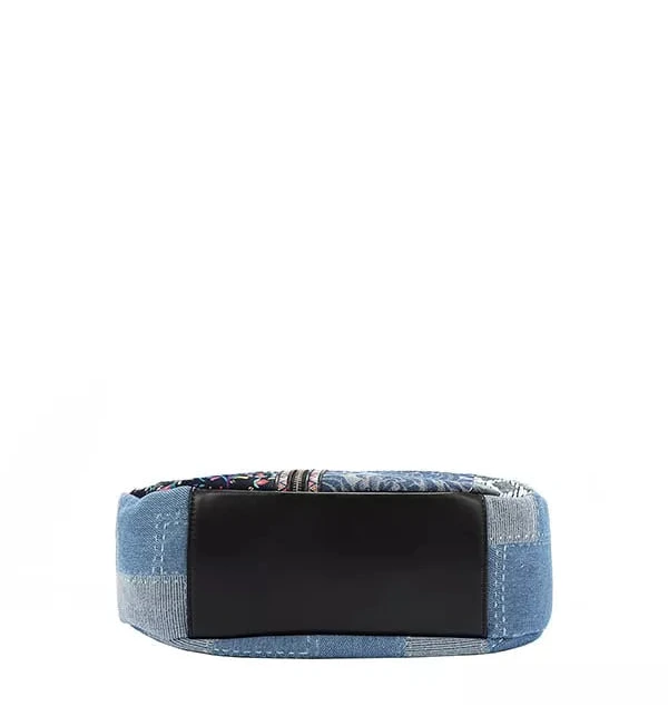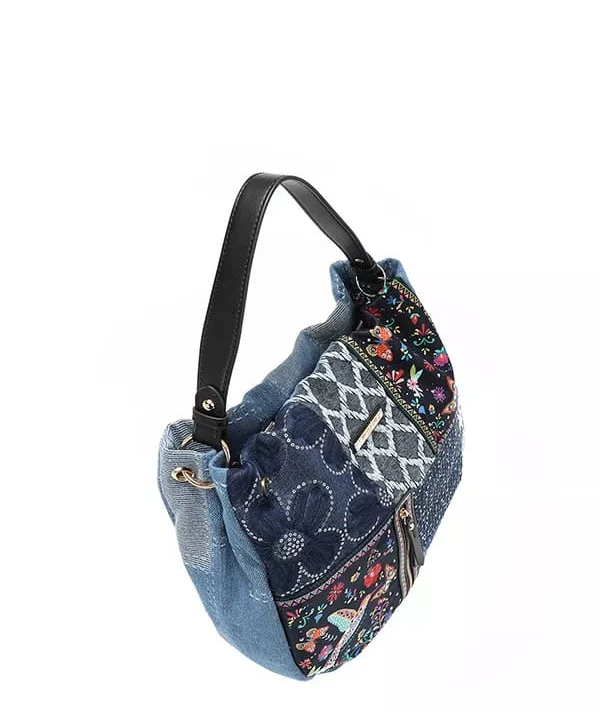 Meet your new go-to bag. This slouchy denim handbag pairs relaxed style with undeniable charm, featuring a cotton denim exterior accented with vegan leather trim. Adorned with sequins, rhinestones, and studded metal stones, plus intricate thread stitching and printed satin details, it's a statement piece that works as hard as you do. Gold-tone hardware & a key ring strap, adds a polished finish to this versatile companion.